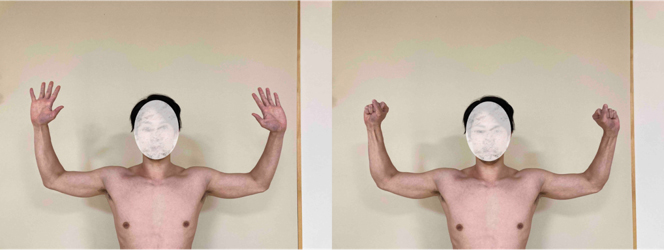【質問9】両腕を挙げて、1秒でグー、1秒でパーをすることを繰り返してください。痛みやしびれが何秒で出現するかを回答してください。